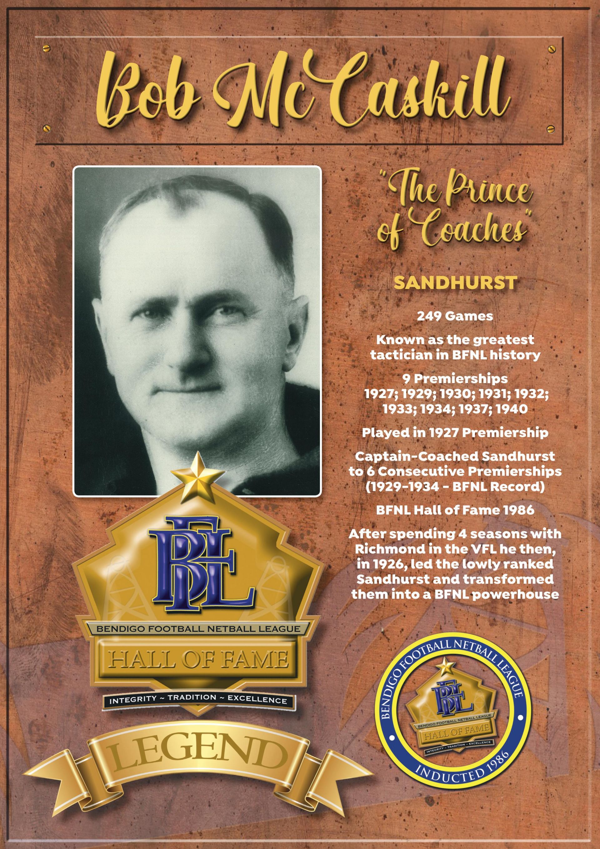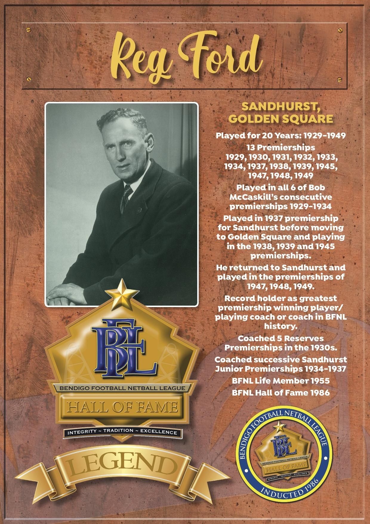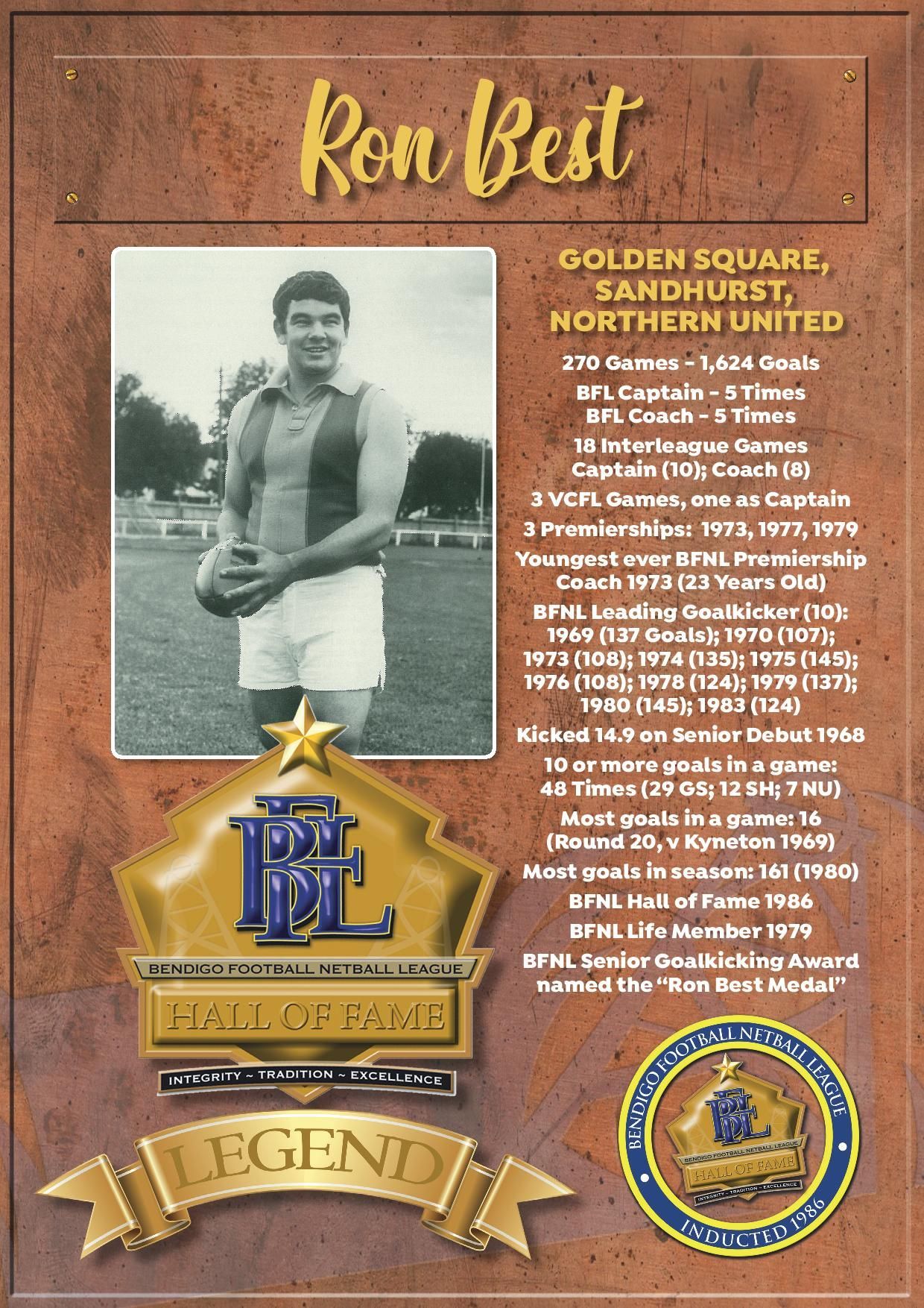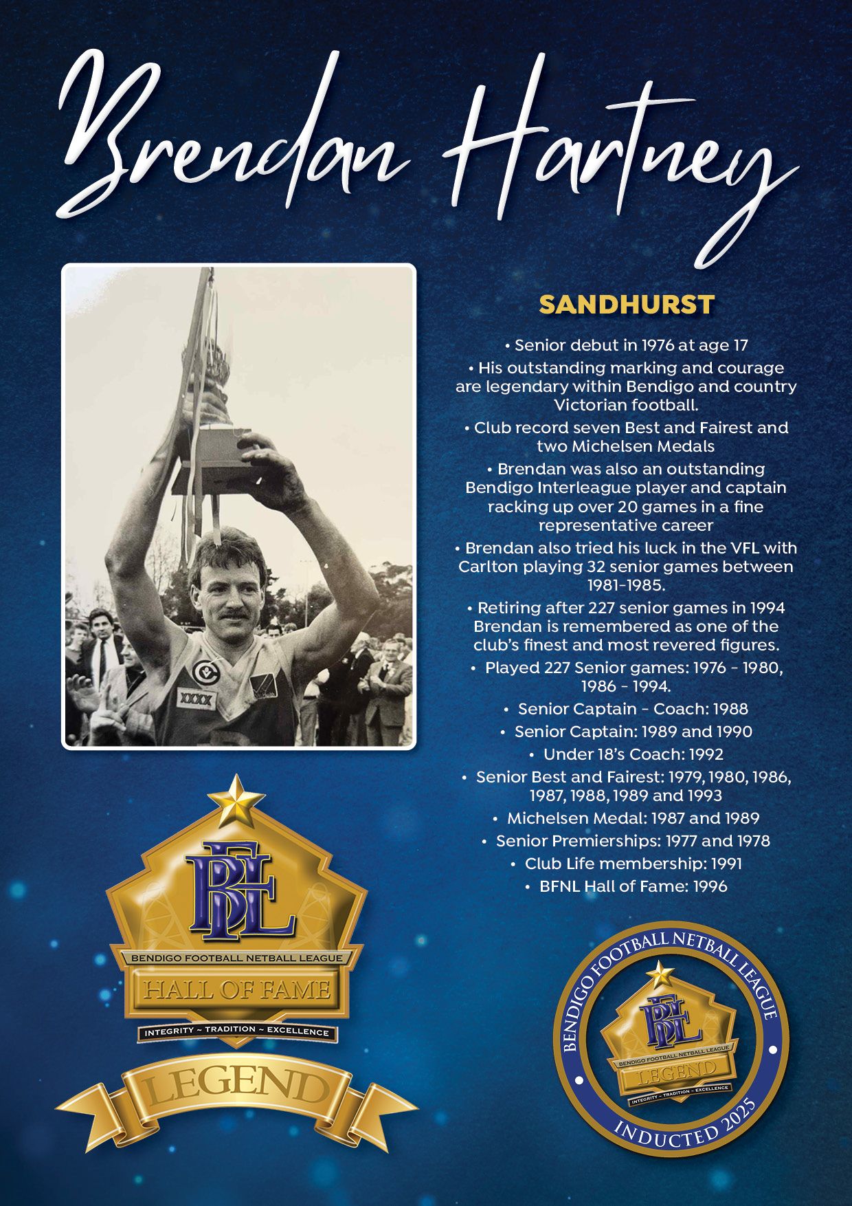 The Bendigo FNL Hall of Fame celebrates the accomplishments of outstanding players, coaches, administrators, media personalities, netballers and any others who have made substantial and distinctive contributions to the promotion of the league.