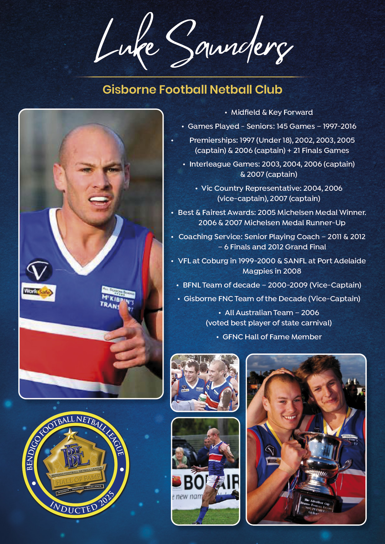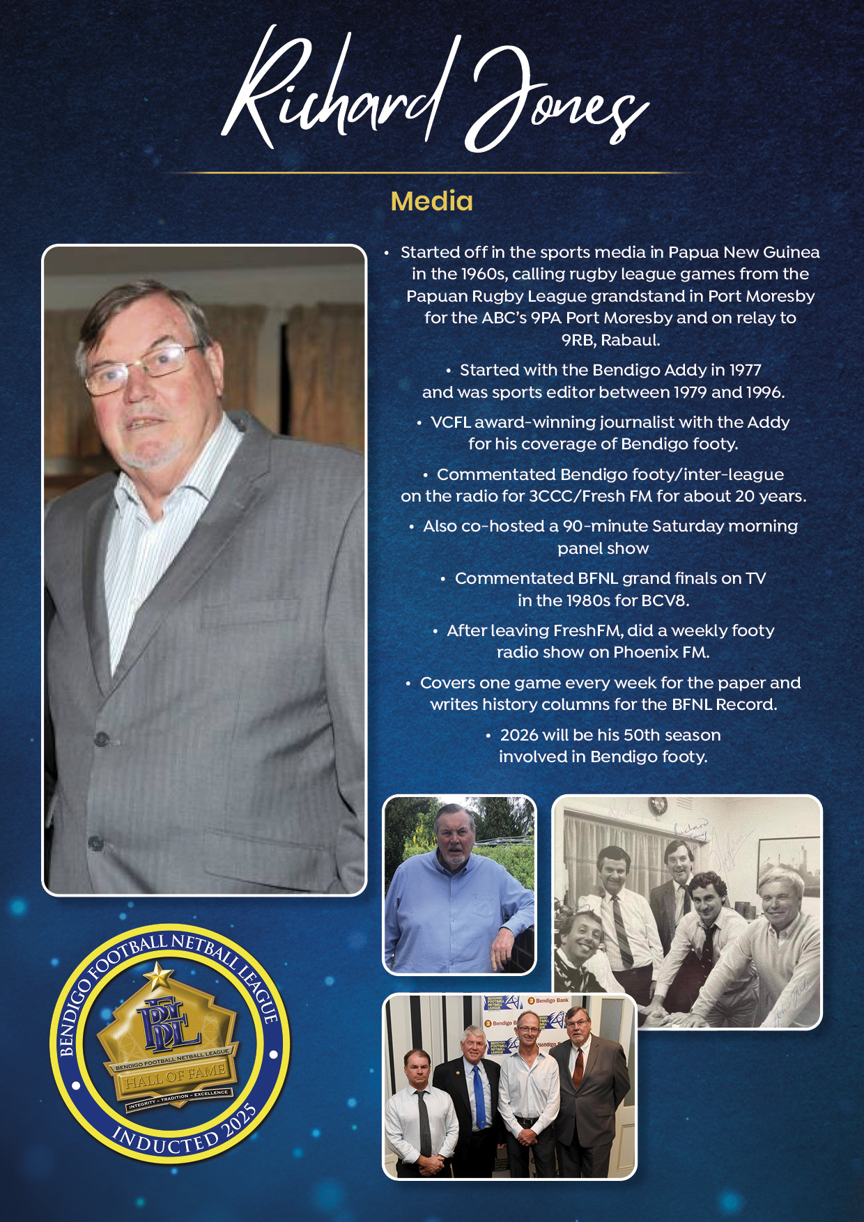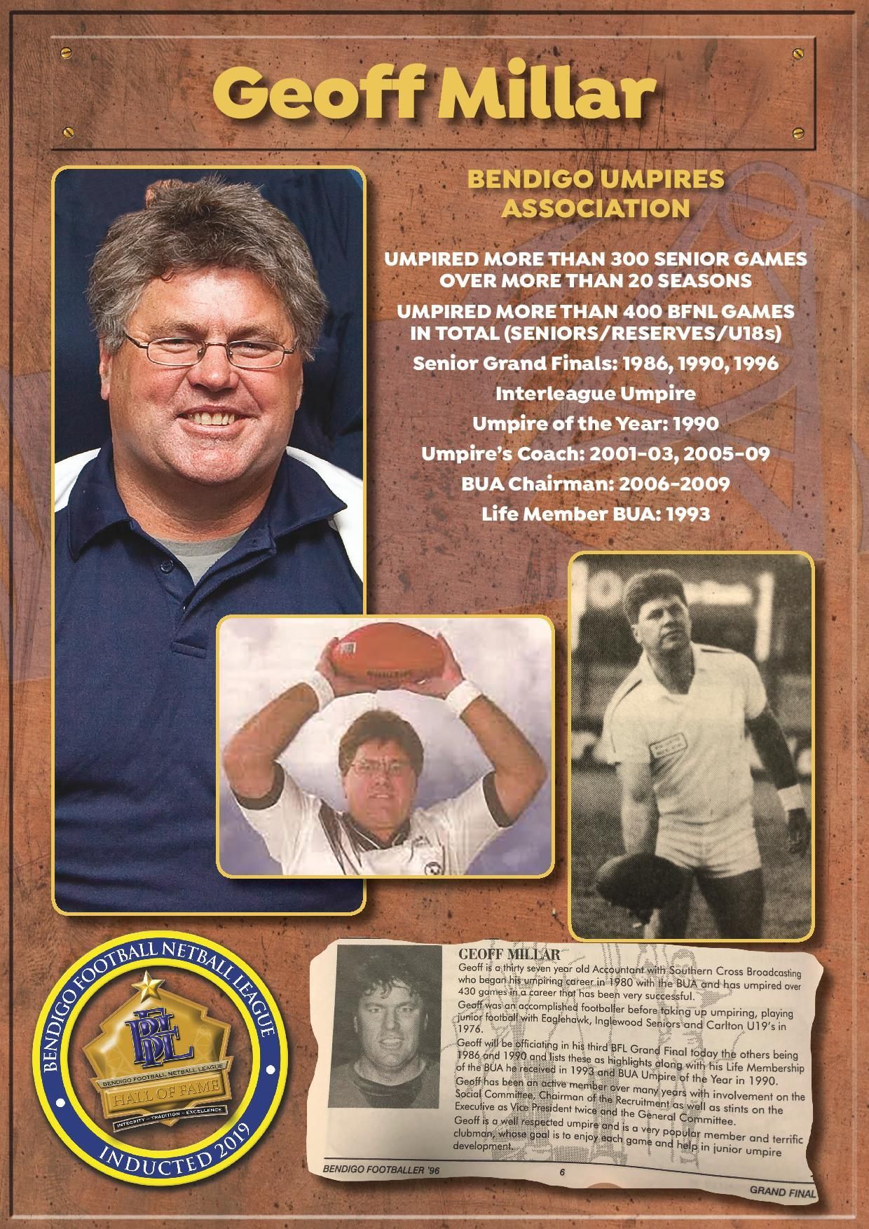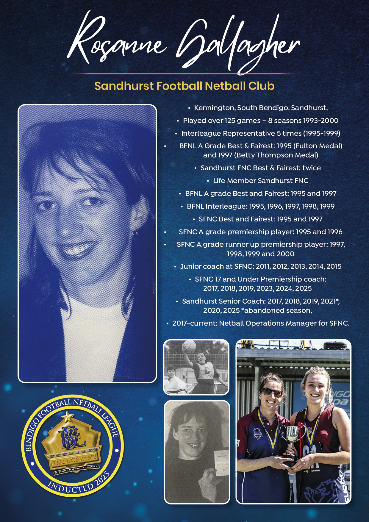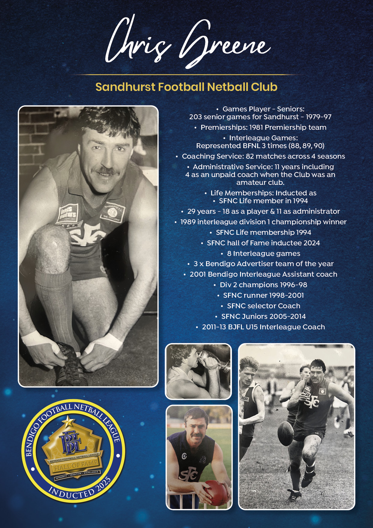 The Bendigo FNL Hall of Fame celebrates the accomplishments of outstanding players, coaches, administrators, media personalities, netballers and any others who have made substantial and distinctive contributions to the promotion of the league.