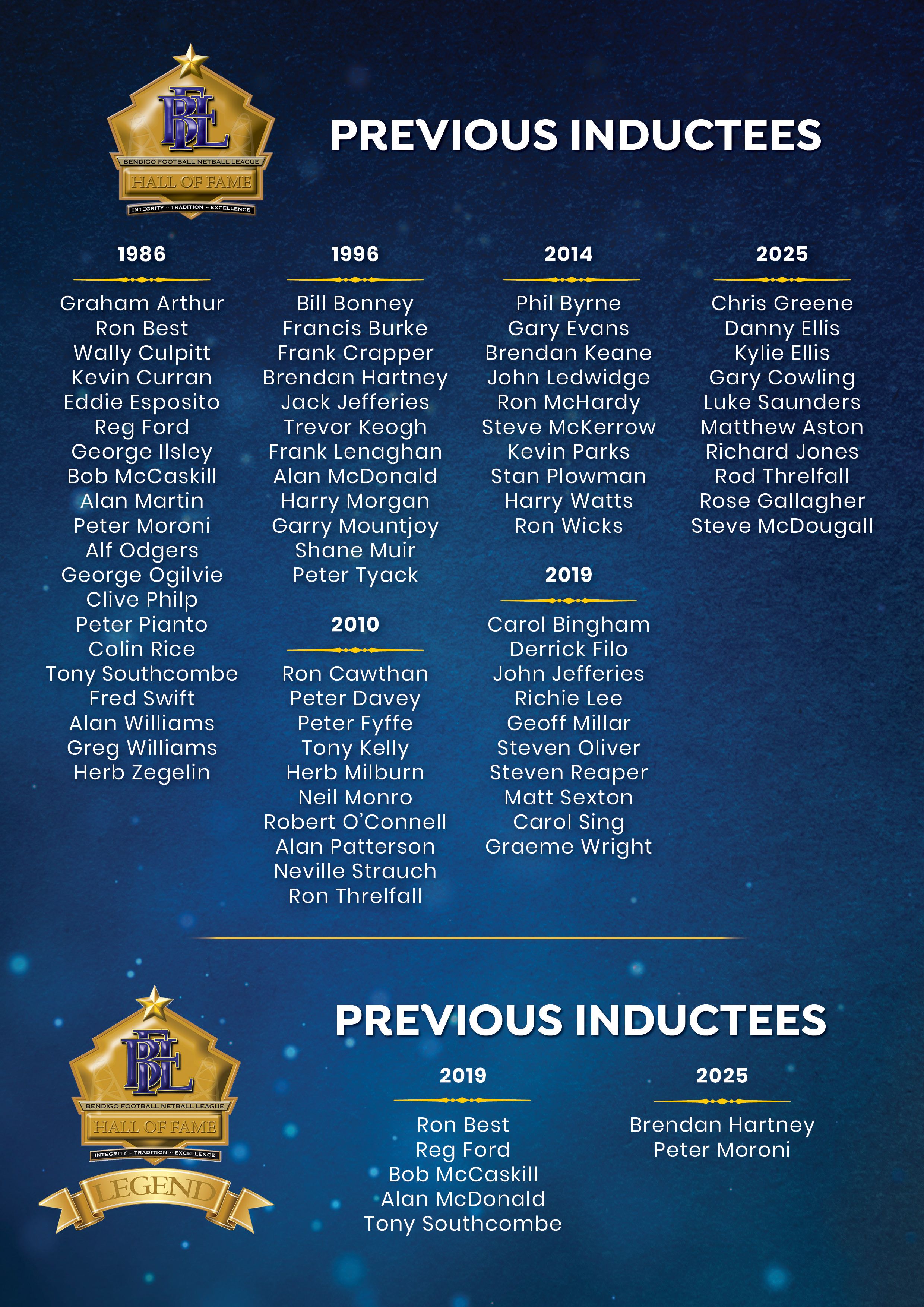 In 2025, the BFNL inducted 10 new Hall of Fame inductees and elevated two names to LEGEND status.