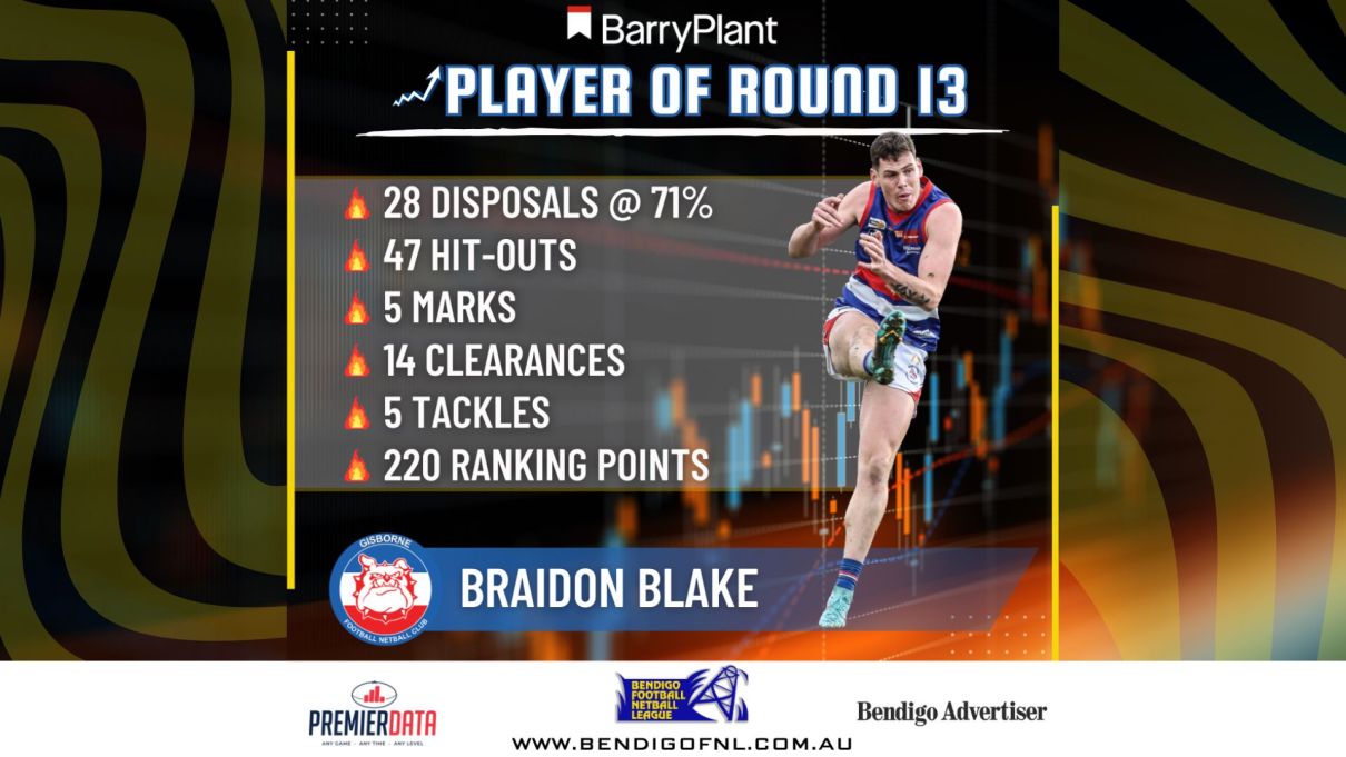 The round 1️⃣3️⃣ Barry Plant Bendigo Player of the Week is BRAIDON BLAKE from the Gisborne Football Netball Club 🔴⚪🔵