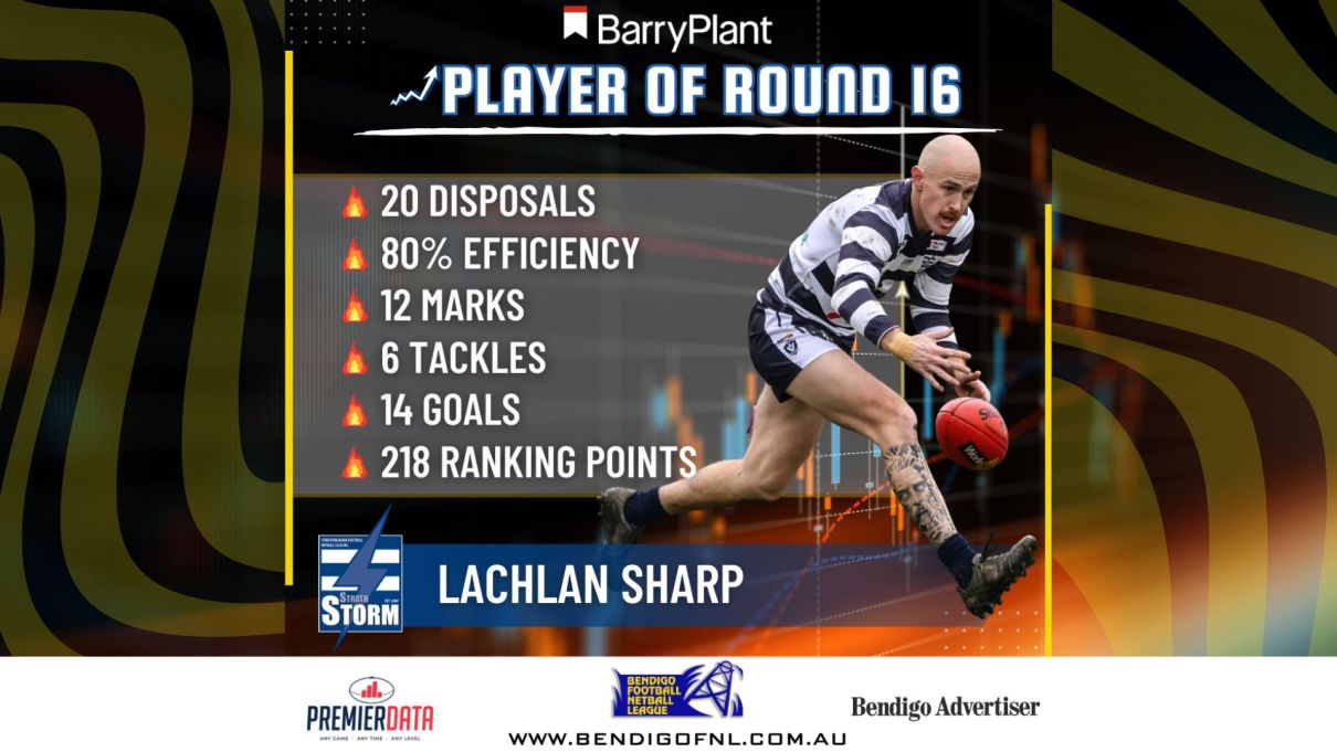 A monster individual 14-goal haul propelled Sharp's Storm team to a big round 16 victory over Kangaroo Flat, but also moved the goal kicking star into 1st position in the race for the 2023 Ron Best Medal with only 2 rounds to play