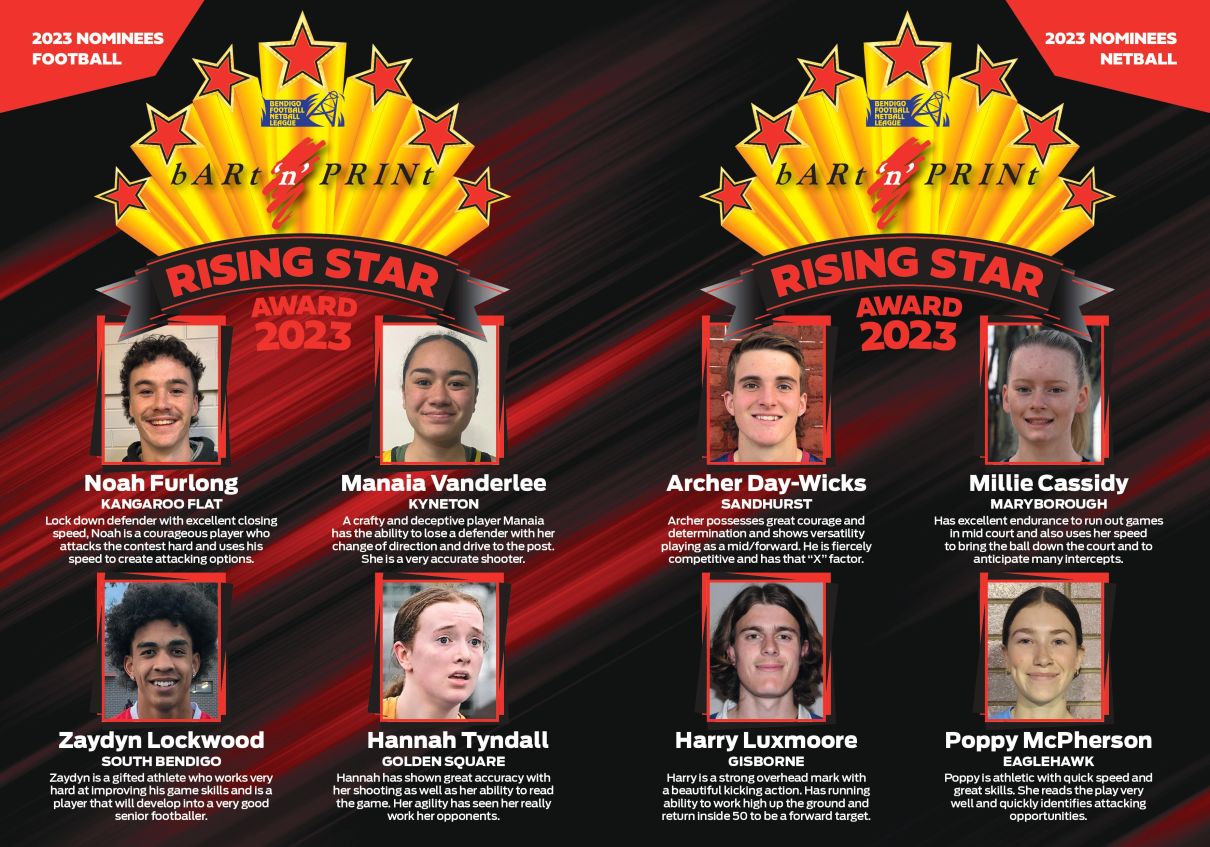 Congratulations to our next wave of exciting talent, who have been nominated as Rising Stars of the BFNL, with special thanks to our continued major partner of the Rising Star award - Bart 'n' Print 🌟🌟