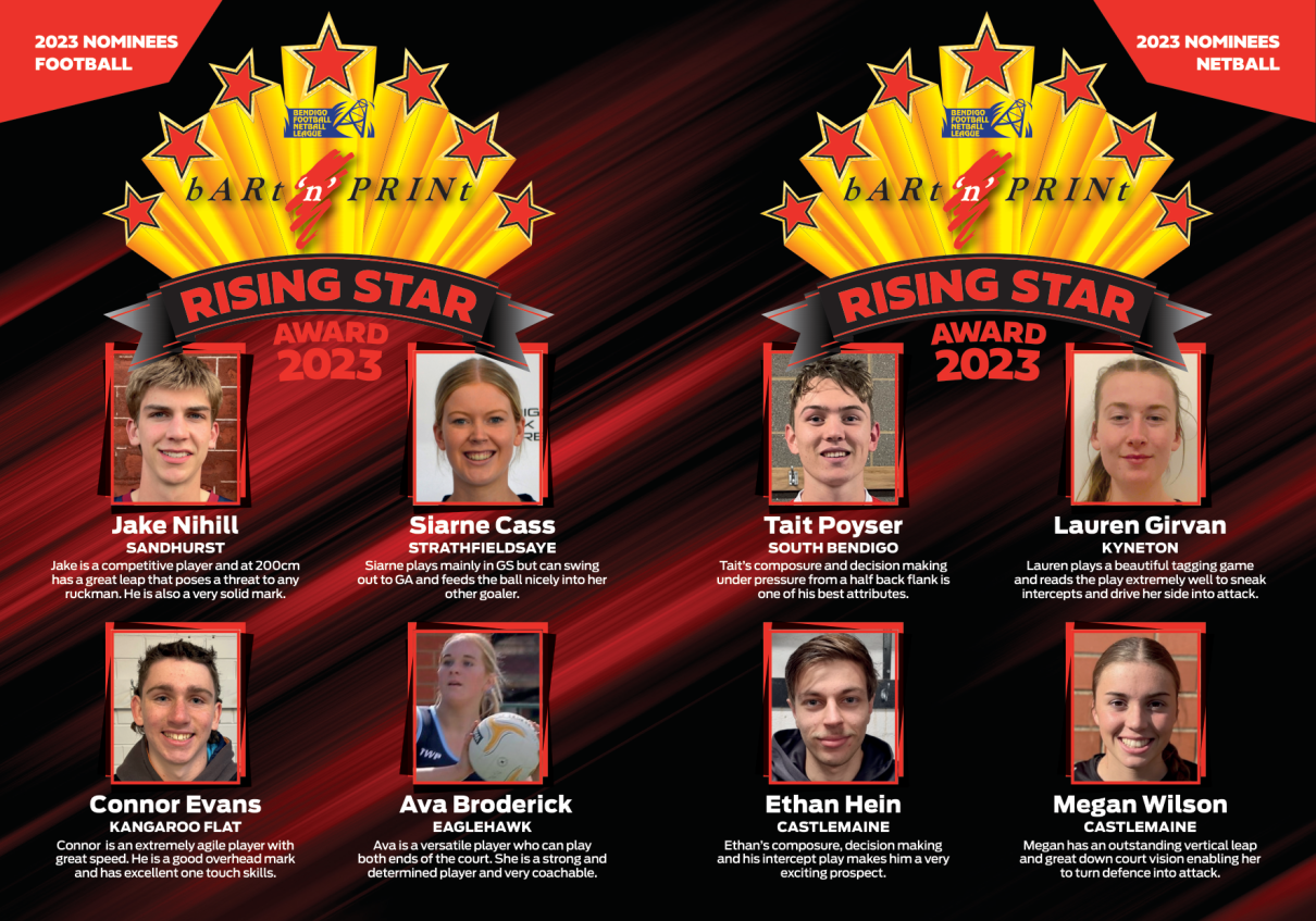 Congratulations to our next wave of exciting talent, who have been nominated as Rising Stars of the BFNL, with special thanks to our continued major partner of the Rising Star award - Bart 'n' Print 🌟🌟