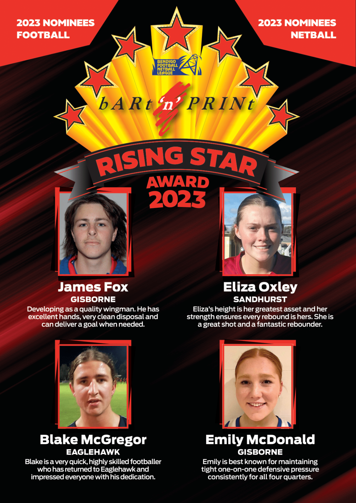 Congratulations to our next wave of exciting talent, who have been nominated as Rising Stars of the BFNL, with special thanks to our continued major partner of the Rising Star award - Bart 'n' Print