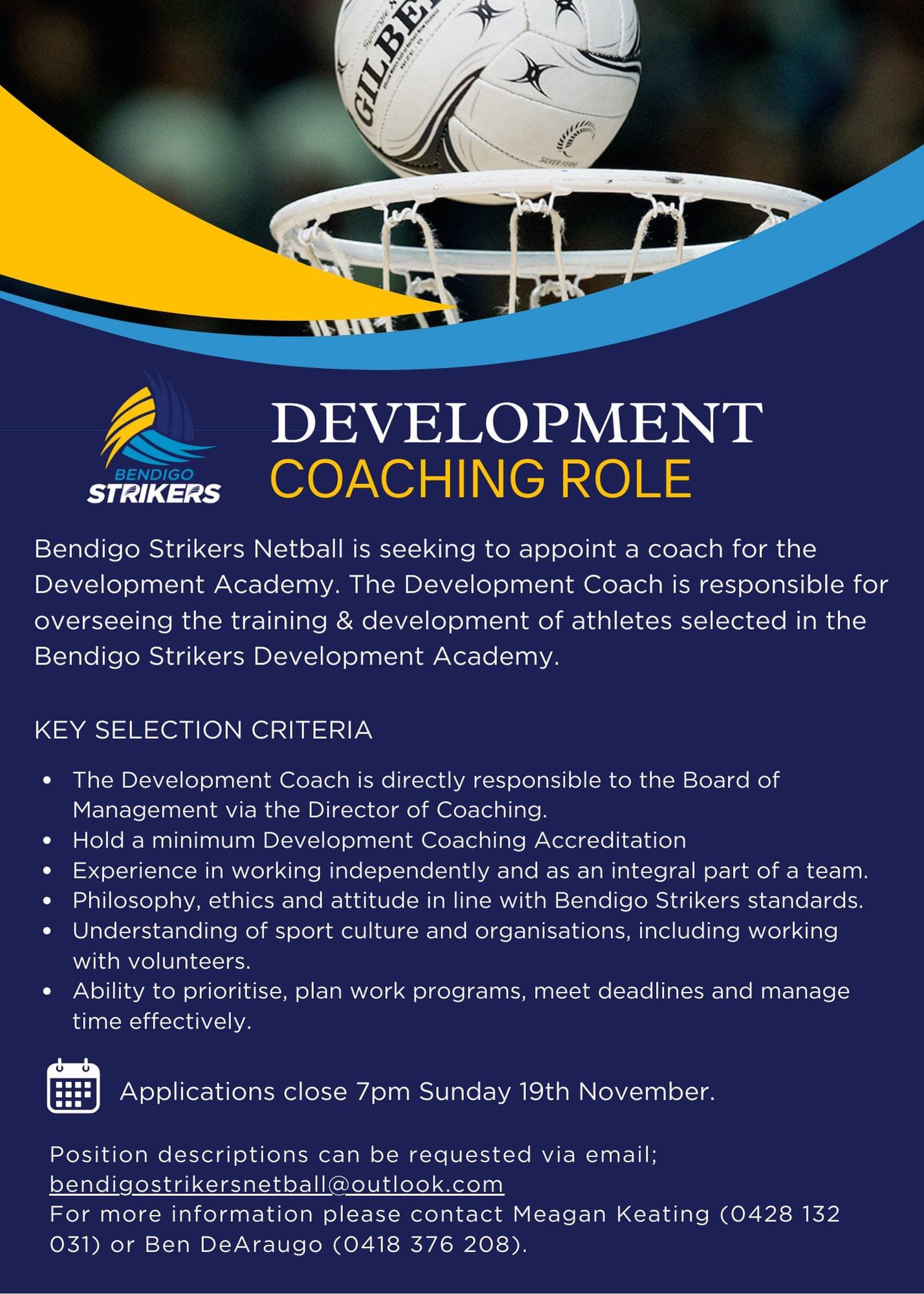 The Bendigo Strikers Netball Club is seeking to appoint a coach for our Development Program. The development coach is responsible for overseeing the training and development of athletes that have been selected in the Bendigo Strikers Development Academy.