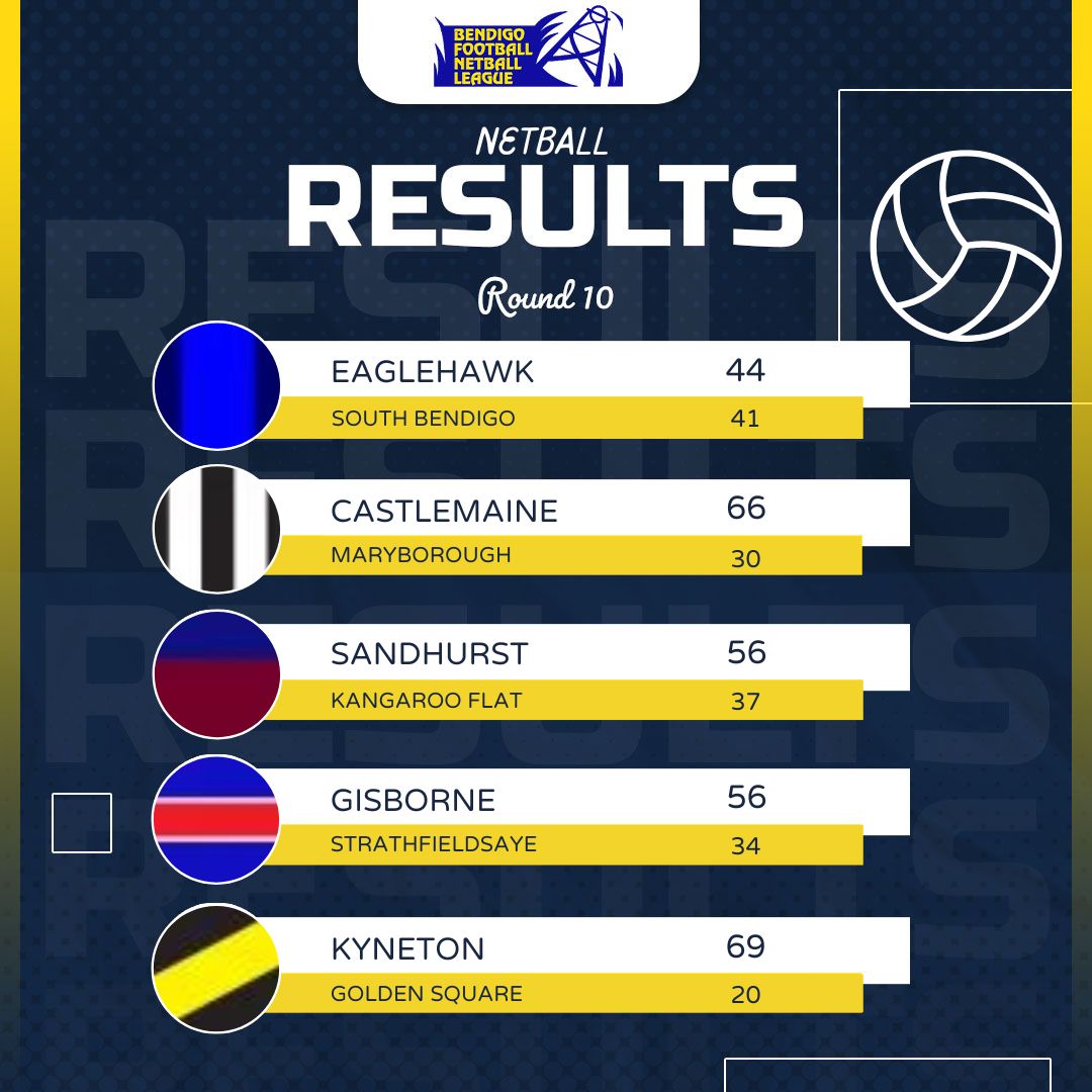 Kangaroo Flat 35 lt Sandhurst 62, Eaglehawk 43 d South Bendigo 34, Strathfieldsaye 30 lt Gisborne 43, Kyneton 9 lt Golden Square 54, Castlemaine 48 d Maryborough 31.