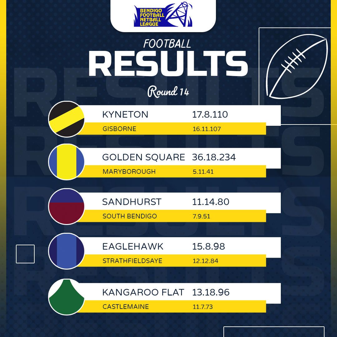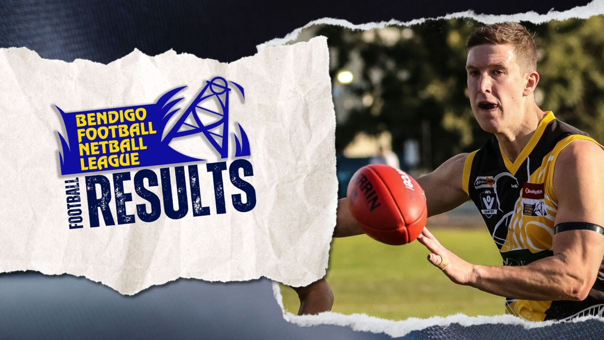Sandhurst 206 per cent, 50 points; Golden Square 238, 48; Eaglehawk 195, 38; South Bendigo 131.8, 32; Strathfieldsaye 131.2, 32; Kyneton 83, 28; Gisborne 125, 24; Kangaroo Flat 63, 20; Castlemaine 41, 8; Maryborough 21, 0.