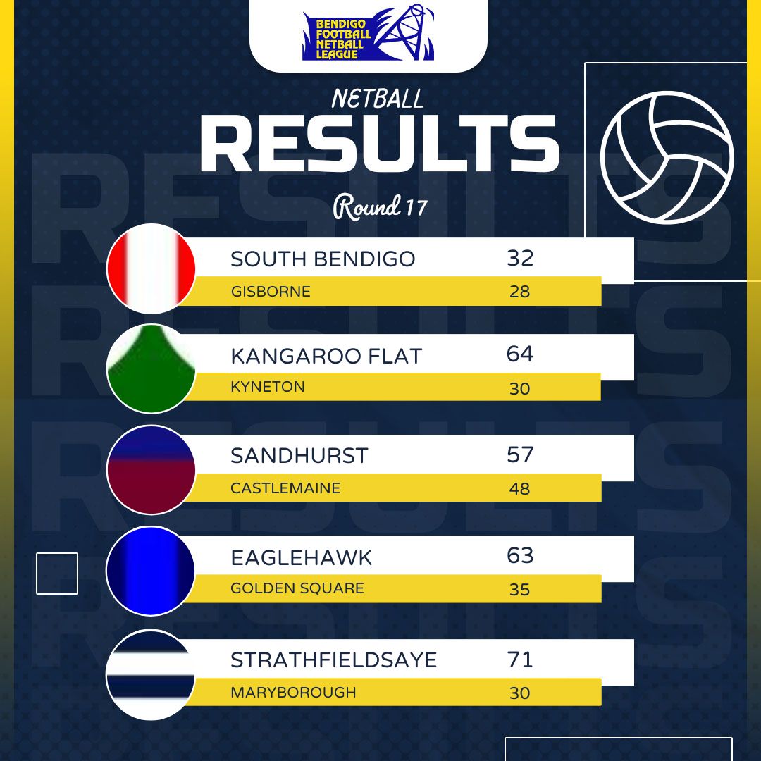 Gisborne 59 d South Bendigo 29, Castlemaine 31 lt Sandhurst 84, Kangaroo Flat 42 d Kyneton 29, Eaglehawk 36 dr Golden Square 36, Strathfieldsaye 52 d Maryborough 17.