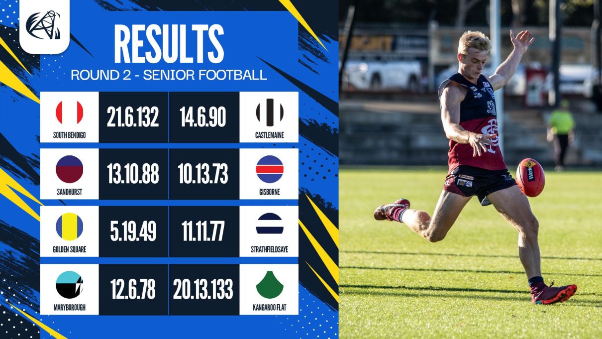 Sandhurst 253 per cent, 8 points; Strathfieldsaye 147, 8; Eaglehawk 132, 4; Castlemaine 113, 4; South Bendigo 107, 4; Kangaroo Flat 65, 4; Gisborne 82, 0; Golden Square 69, 0; Maryborough 53, 0.