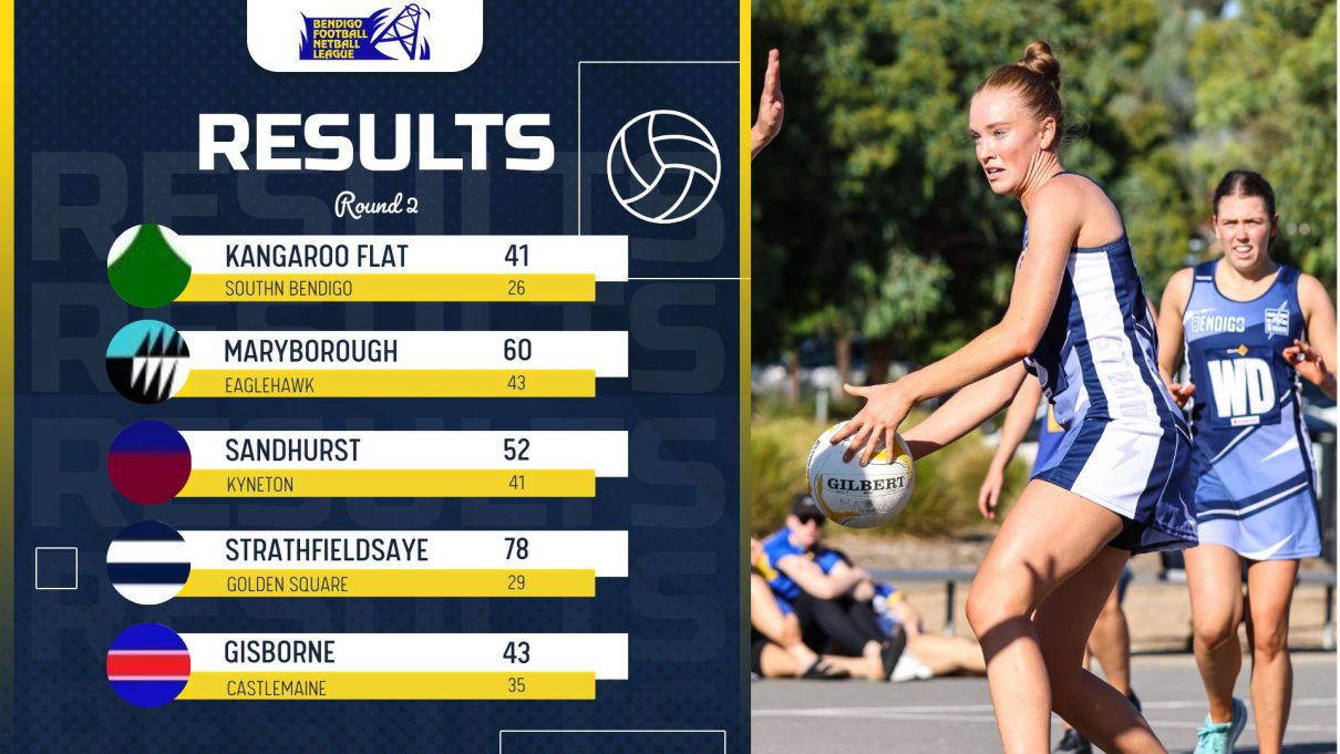 Castlemaine 28 lt Gisborne 44, Kangaroo Flat 47 d South Bendigo 35, Kyneton 14 lt Sandhurst 75, Strathfieldsaye 50 d Golden Square 18, Eaglehawk 71 d Maryborough 28.