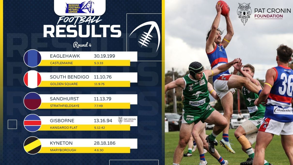 Eaglehawk 355 per cent, 16 points; Sandhurst 172, 16; South Bendigo 141, 12; Strathfieldsaye 126, 8; Gisborne 125, 8; Golden Square 112, 8; Kyneton 94, 4; Kangaroo Flat 67, 4; Castlemaine 28, 4; Maryborough 26, 0.