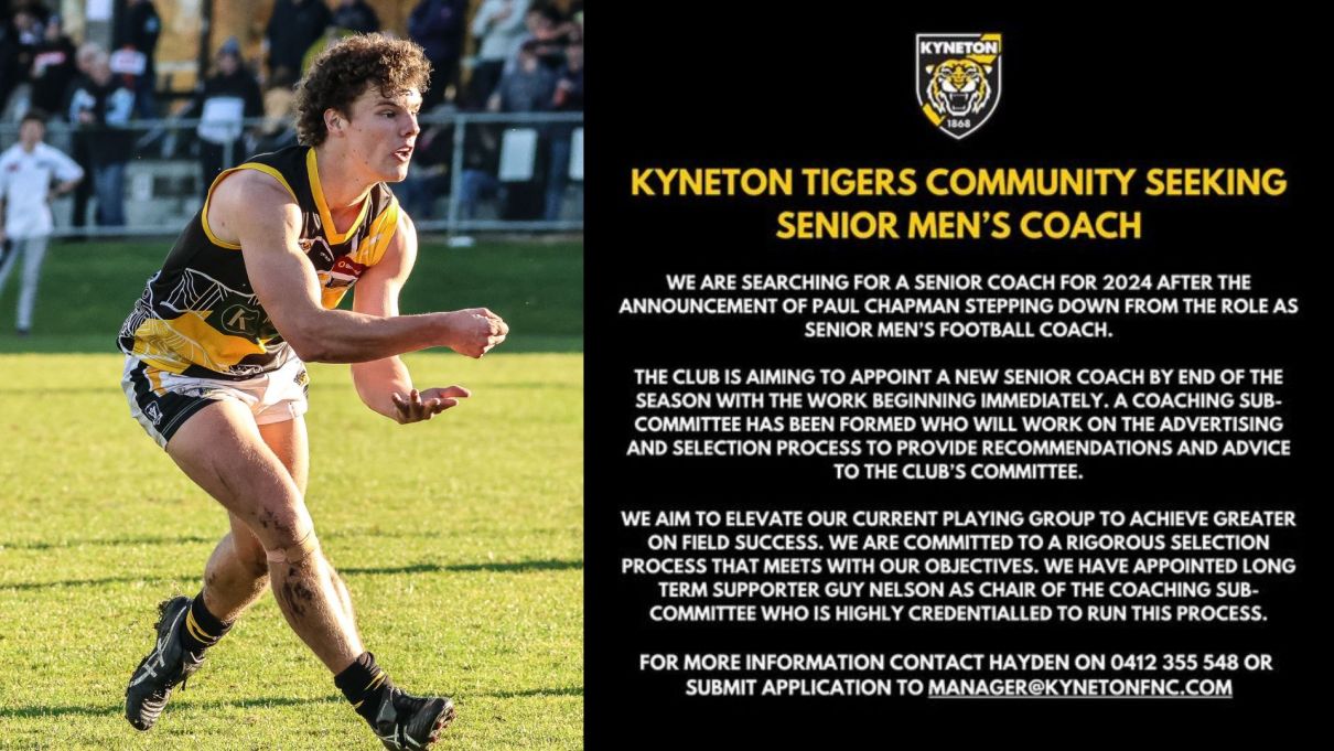 The Kyneton Tigers are embarking on a search for a senior coach for 2024 after the announcement of Paul Chapman stepping down from the role as Senior Men’s Football Coach.