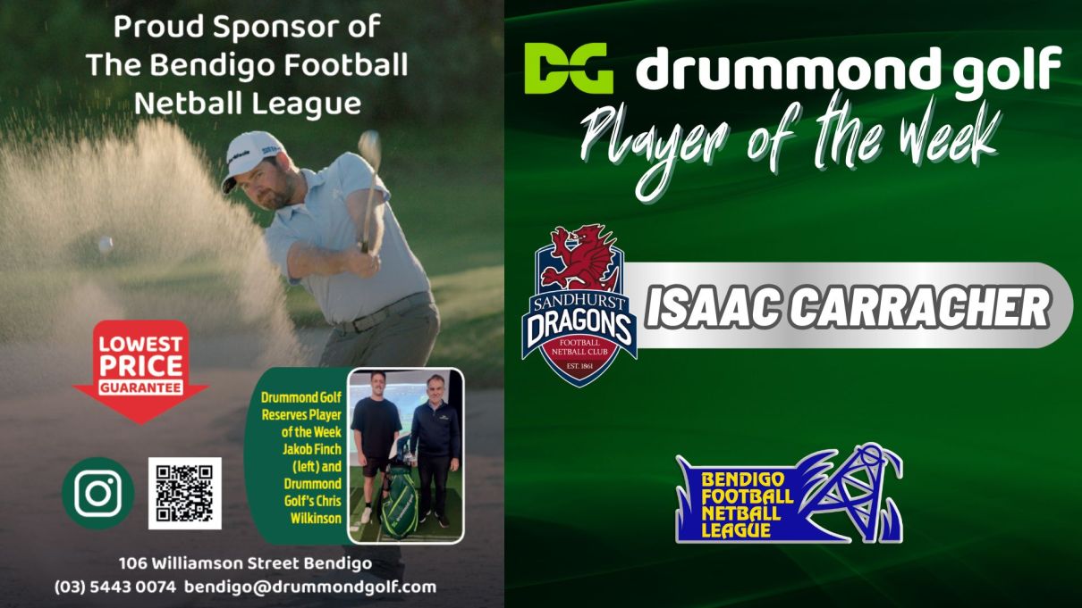 Congratulations to ISAAC CARRACHER of the Sandhurst Football Netball Club who has been selected as the Drummond Golf Reserves Player of the Week, leading the top of the table Dragon's to a big Round 5 victory