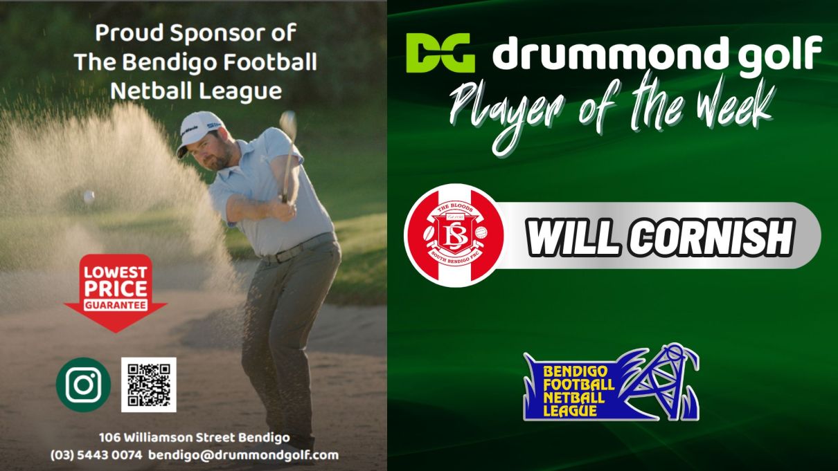 Congratulations to WILL CORNISH of the South Bendigo FNC who has been selected as the Drummond Golf Reserves Player of the Week, on the back of a hugely consistent season to date, selected in the Bloods best players again for the 5th occasion from 9 games played to date this season!