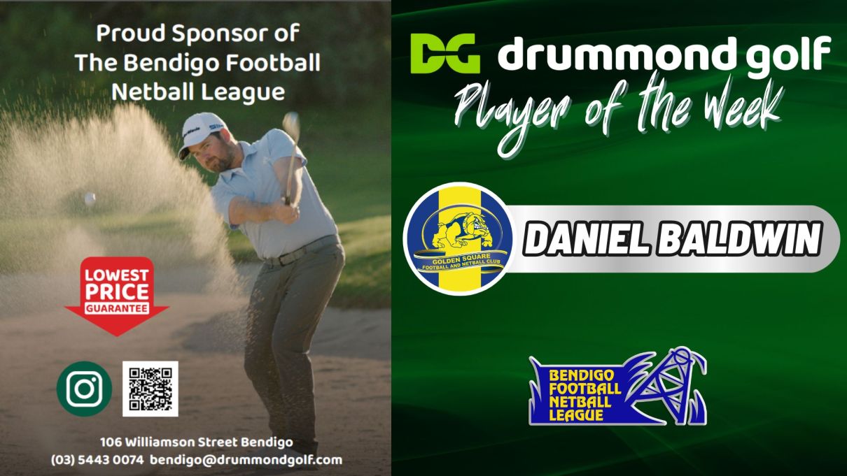 Congratulations to DANIEL BALDWIN of the Golden Square Football Netball Club who has been selected as the Drummond Golf Reserves Player of the Week, his 3-goal effort contributed to a big Bulldog victory over South Bendigo.
