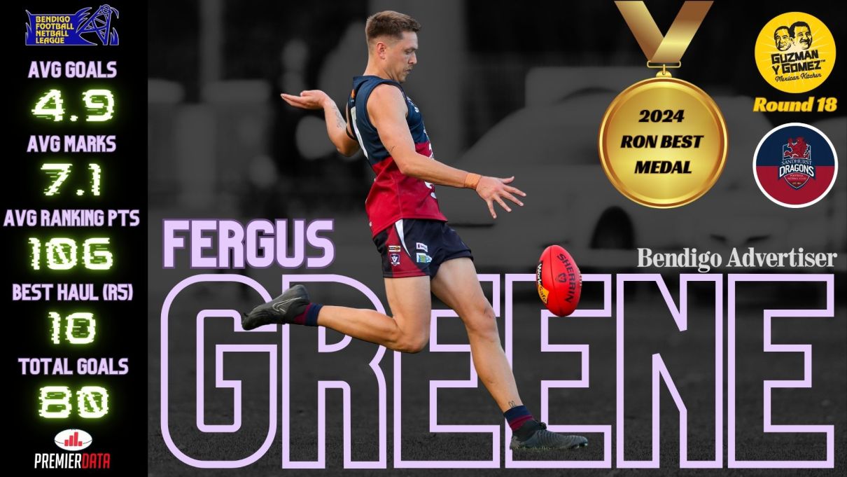 Greene has had a superb season in the forward 50 arc, leading the Dragon's to the Minor Premiership. His 2 biggest individual hauls for the season include a 9-goal game in round 4, backed up by a huge 10-goal performance the following week against South Bendigo.