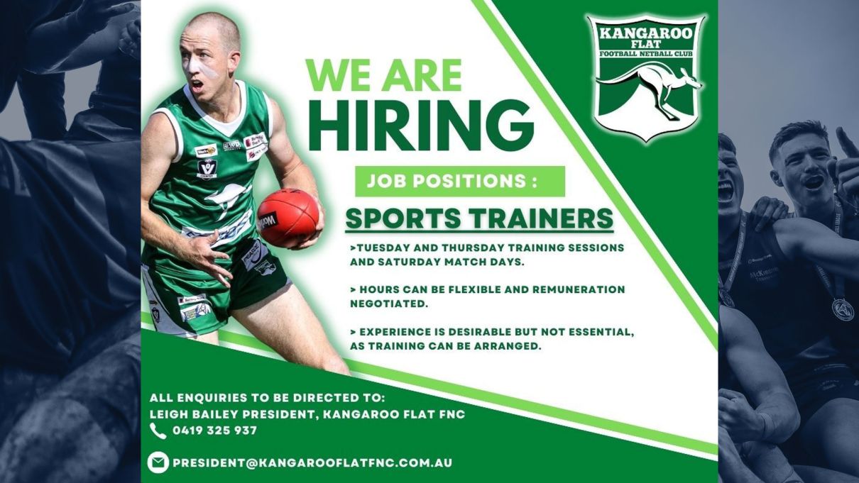 The Kangaroo Flat Football Netball Club, affiliated with the Bendigo Football Netball League, is seeking sports trainers for the 2023 football and netball season.