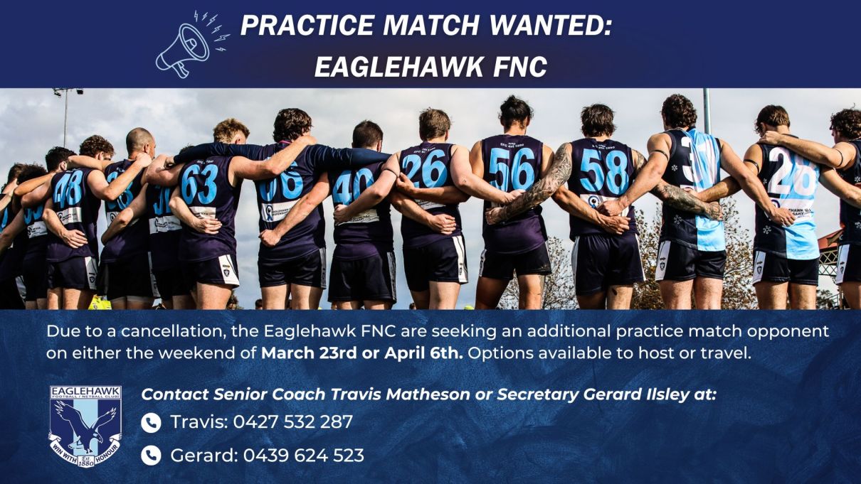 Due to a cancellation, the Eaglehawk FNC are seeking an additional practice match opponent on either the weekend of March 23rd or April 6th.