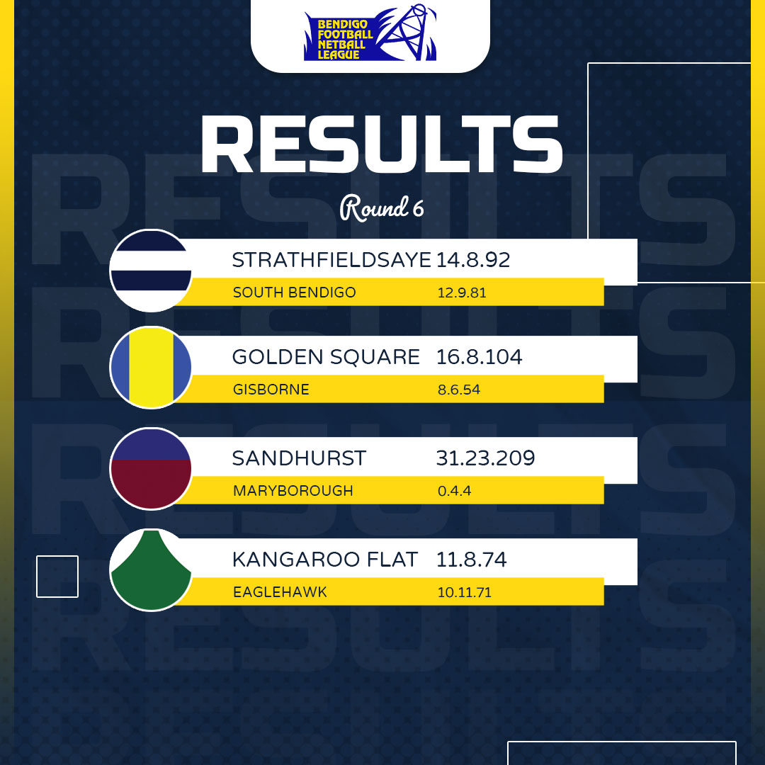 Sandhurst 261 per cent, 24 points; Eaglehawk 288, 20; Golden Square 190, 16; South Bendigo 107, 12; Strathfieldsaye 101, 12; Kangaroo Flat 88, 12; Gisborne 103, 8; Kyneton 95, 8; Castlemaine 32, 4; Maryborough 15, 0.