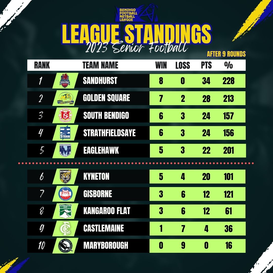 So far – d South Bendigo 58-48, d Maryborough 179-10, d Gisborne 112-63, d Castlemaine 199-33, d Strathfieldsaye 99-21, lt Kangaroo Flat 71-74, lt Kyneton 76-77, lt Golden Square 67-70, dr Sandhurst 64-64.